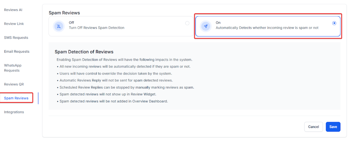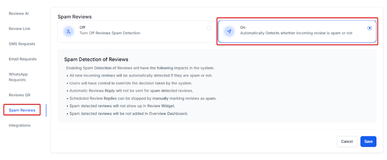 Once enabled, the system will automatically begin detecting spam reviews, which will then be flagged and visually marked in the Reviews section.