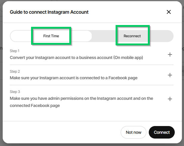 Each guide includes step-by-step instructions and videos. You’ll find options for both first-time connections and reconnecting your accounts—simply choose the one that applies to you. To view the full details for any step, click the “+” icon to expand the instructions.