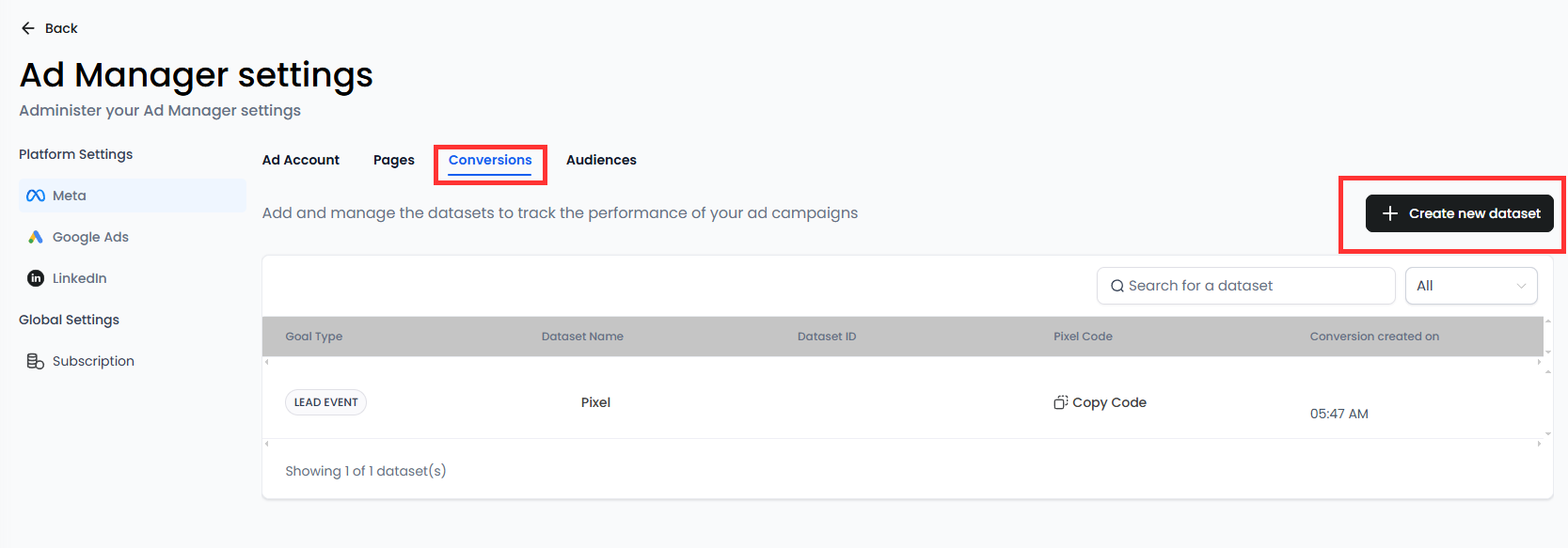 - Create New Dataset: Add new data sets with the Create New Dataset option to track specific actions for your campaigns. The dataset ID and code are automatically generated, simplifying workflow creation for sending CAPI events back to Facebook.