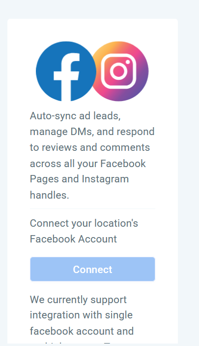 - Click Connect under your Facebook and Instagram to connect both. (To start, the icons will both be grayed out and turn colorful once the integration is complete.)