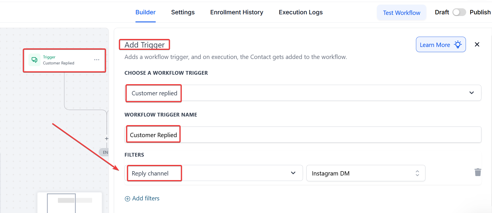 - You can also navigate to Workflows, select the trigger Customer Replied and filter by “reply channel” and choose “Instagram DM” to set up the trigger based on Instagram DMs coming in.