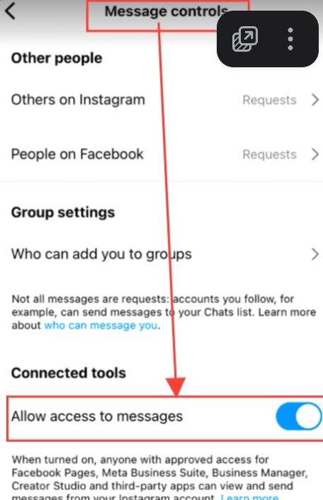 - If you toggle on this access, anyone with approved access to your Facebook Business Suite, Creator Studio, or other connected third-party apps can view or manage your Instagram Direct Messages.