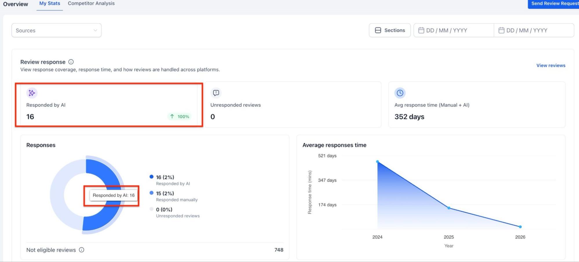 Track how effectively feedback is being handled by measuring response rates and average response times. The dashboard also distinguishes between AI generated responses and manual ones, while highlighting any reviews that have not yet received a reply.