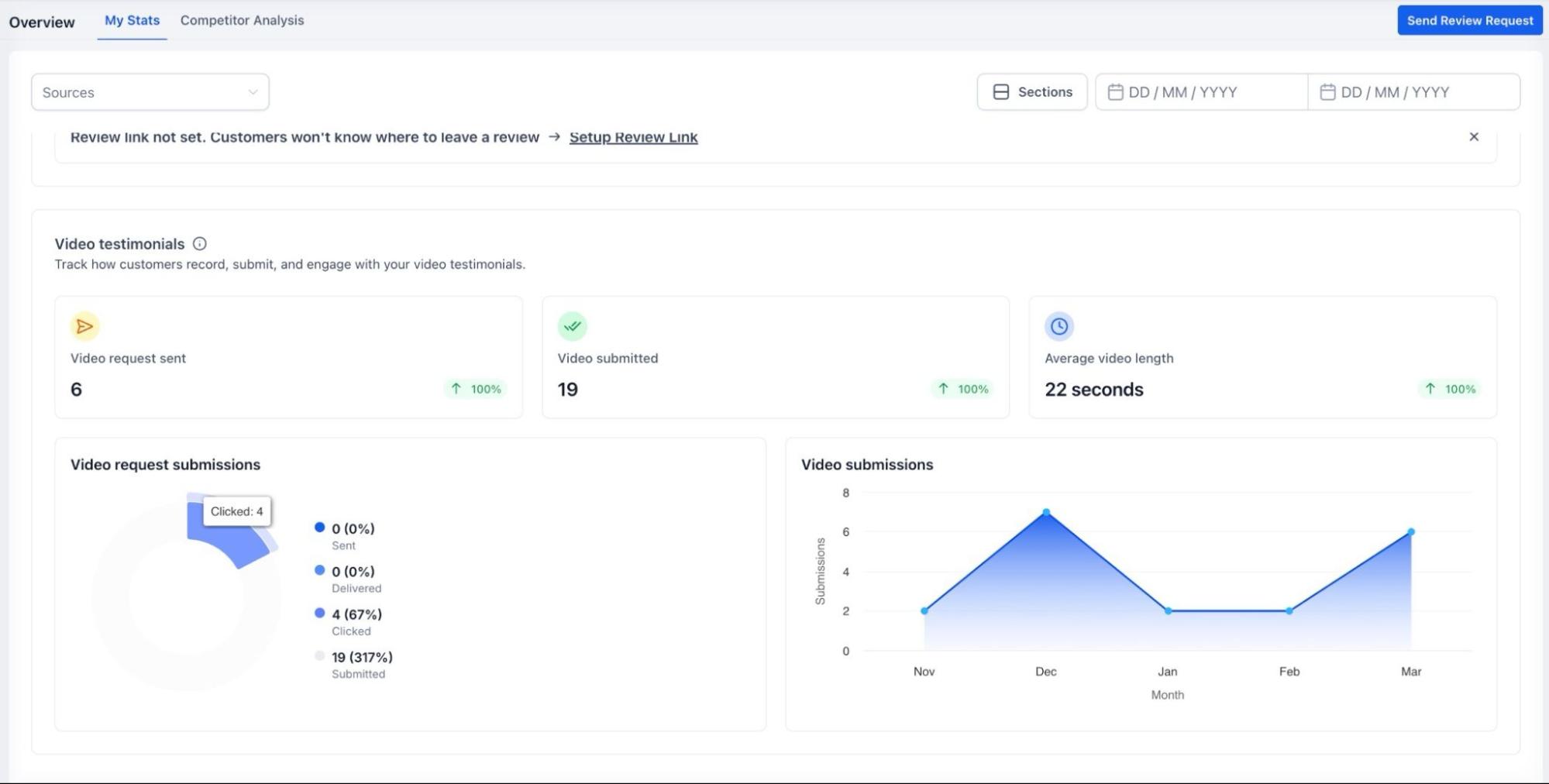 For accounts utilizing video feedback, the dashboard monitors requests sent, successful submissions, and engagement levels. You can track conversion performance, average video length, and overall submission trends.