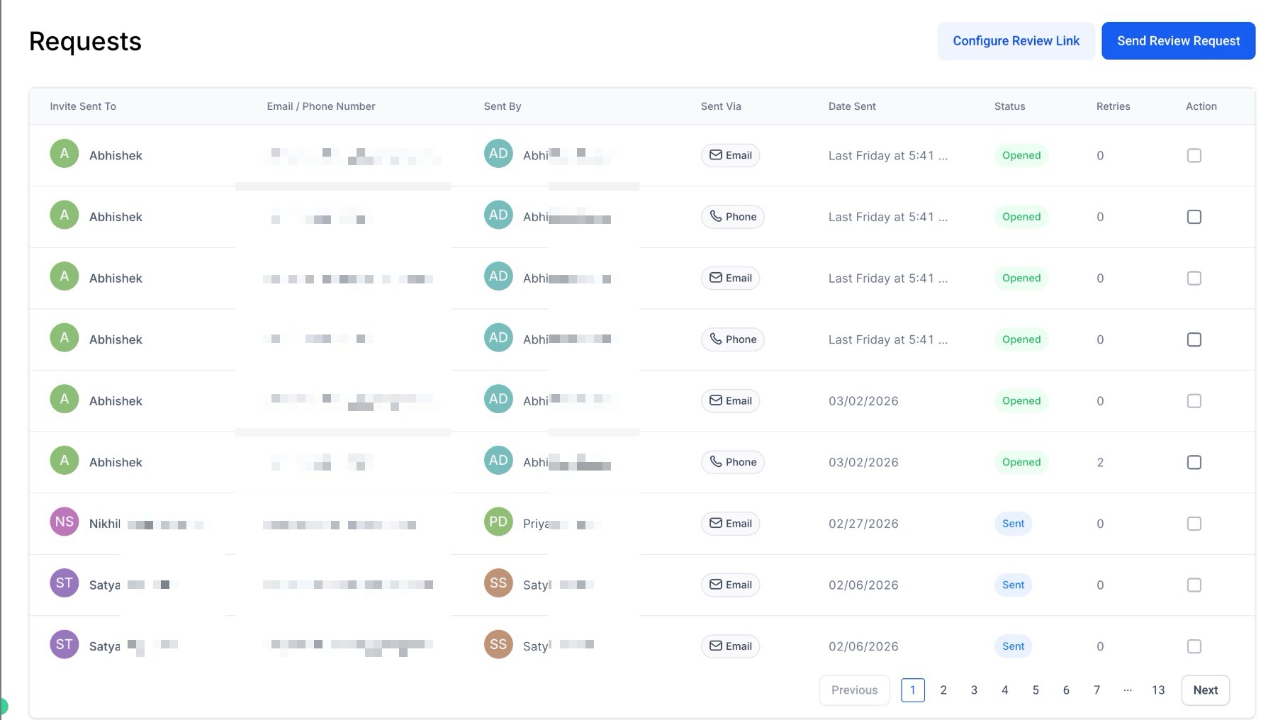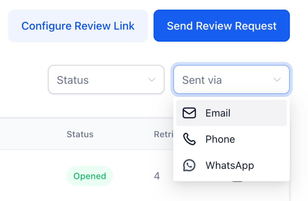 Answer: This section shows recent review invites sent, including the channel used (SMS/Email/WhatsApp) and the date of each request.