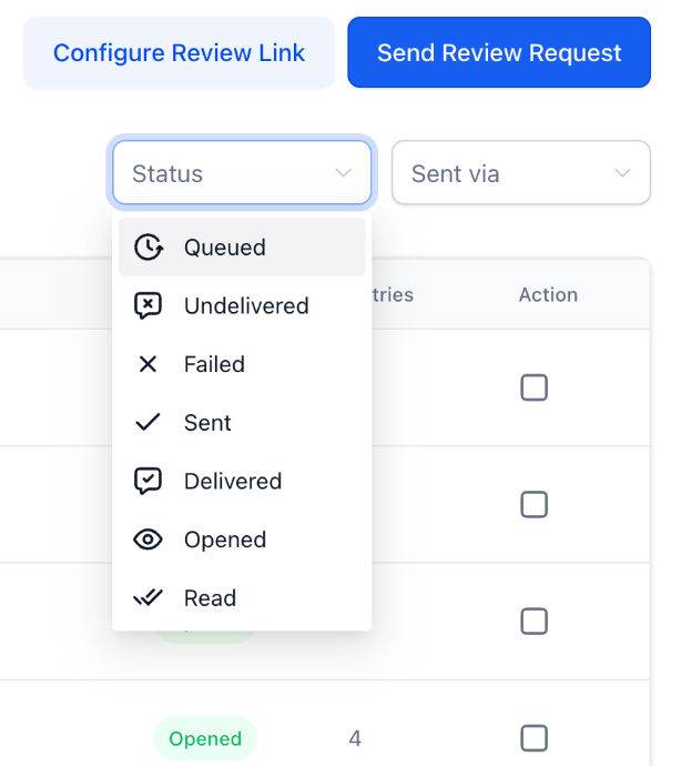 Statuses: Failed, Undelivered, Sent, Opened, and other supported states