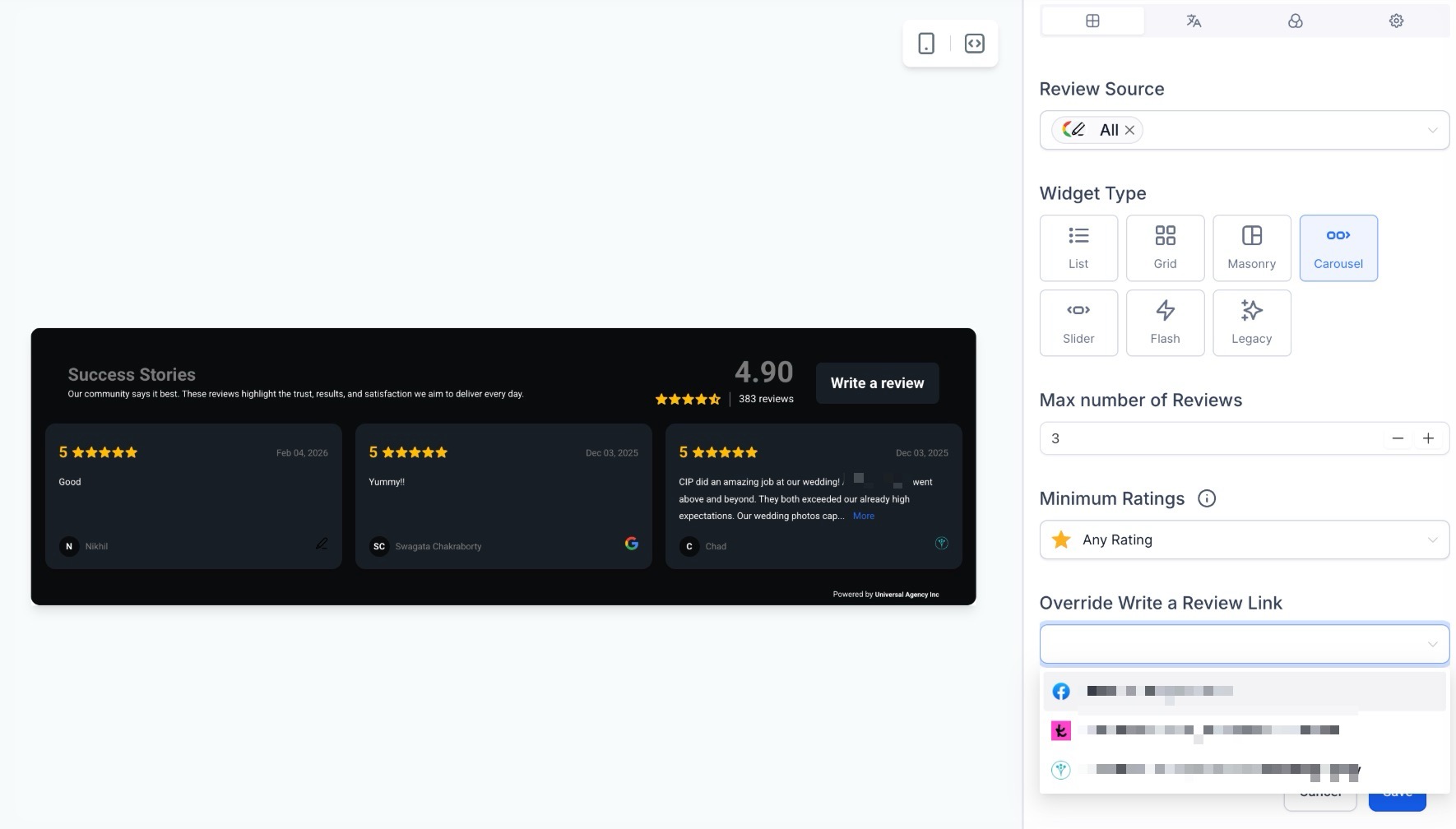 Within the Widget management settings, you can view, select, and override review links directly. This ensures that your website widgets always direct customers to the correct and most relevant review destination.