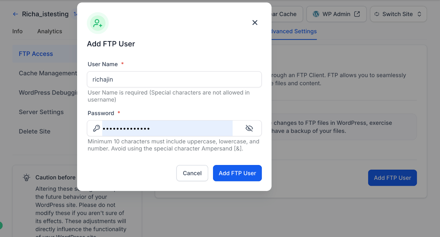 2. Click on Add FTP User and input the credentials.