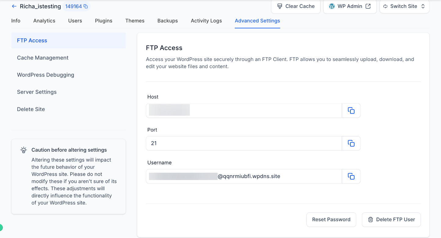 3. The Host URL, Port number, Username, and Password can be used to log in to a client program and access the WordPress files. Make sure to keep these credentials safe. The UserName and Password are unique for each user, and you can even reset them.