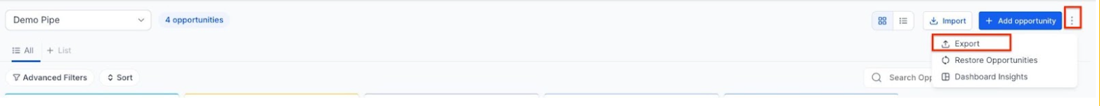 Once you've set your desired filters (if any), click on the three dots> "Export" button, situated at the top right corner of the Opportunities section.