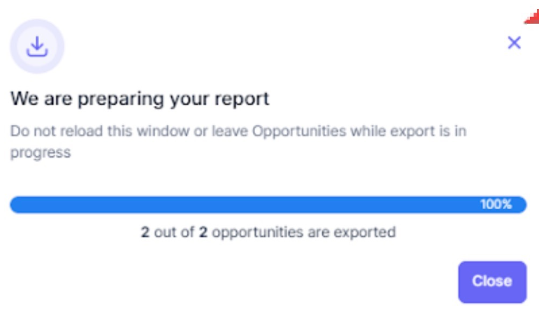 After clicking the "Export" button, a progress bar will appear, showing the status of your export. It's important to avoid reloading the page or navigating away from the "Opportunities" section during this process. Once the export is complete, you'll receive a downloadable file containing all the exported data.