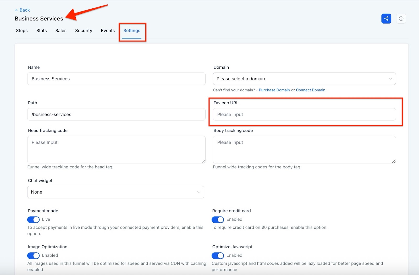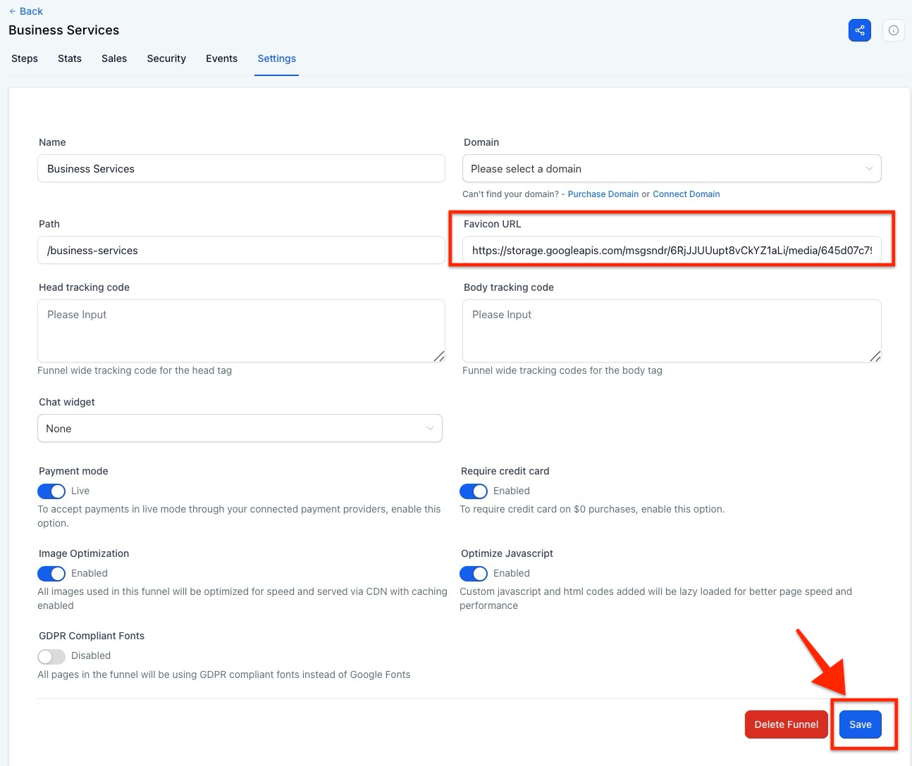 - Return to the settings of your funnel or website and paste the copied URL into the favicon URL field.