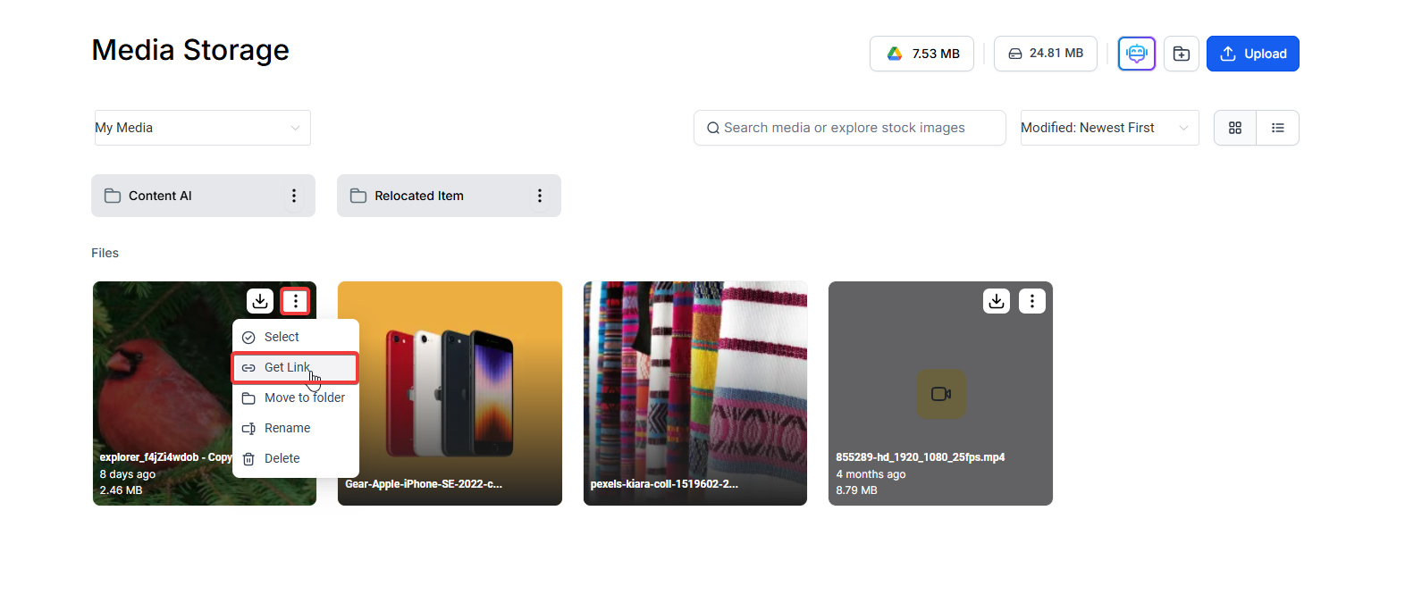 - Copy the image URL to your clipboard by clicking the "Get link" button in your media tab.