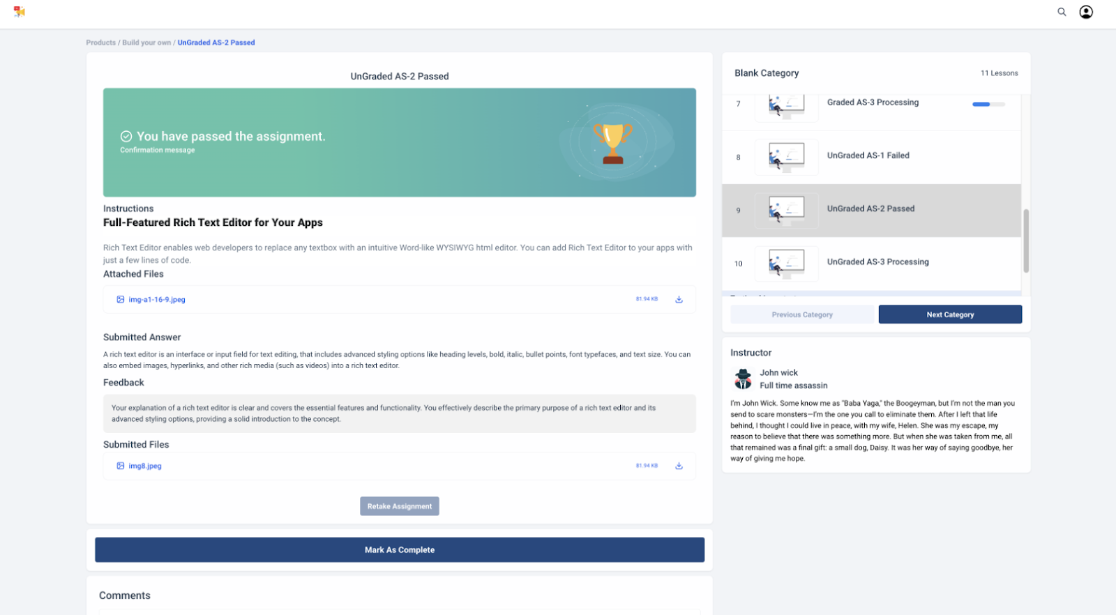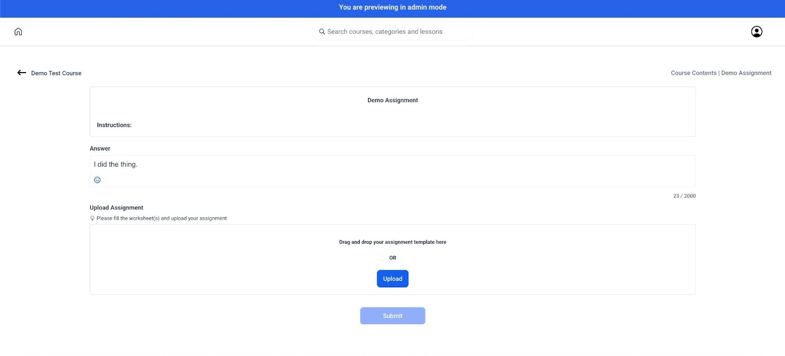 This Assignment type can be used to create offline Assignments, which allow course creators to upload a questionnaire with instructions and manually grade them. The student can write their answers in a paragraph area online or upload answer sheets.