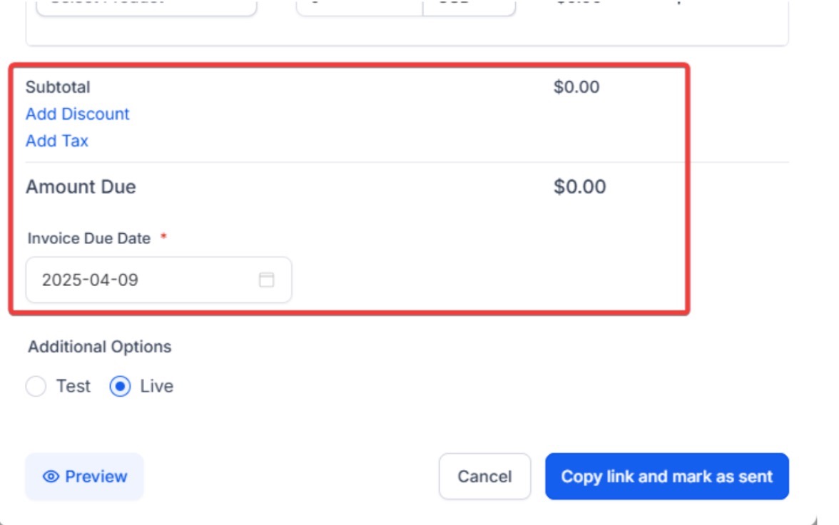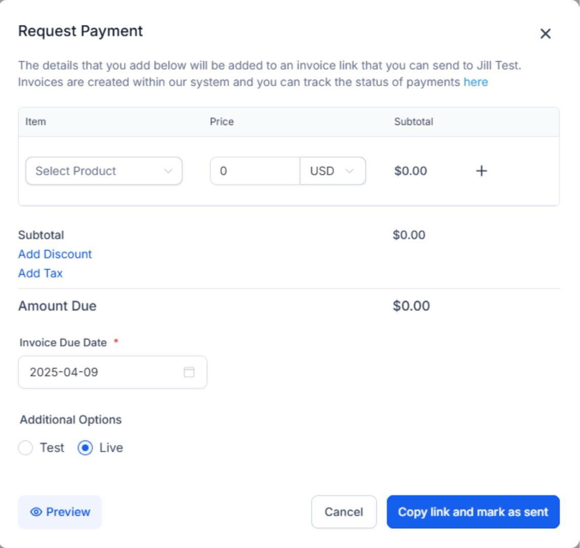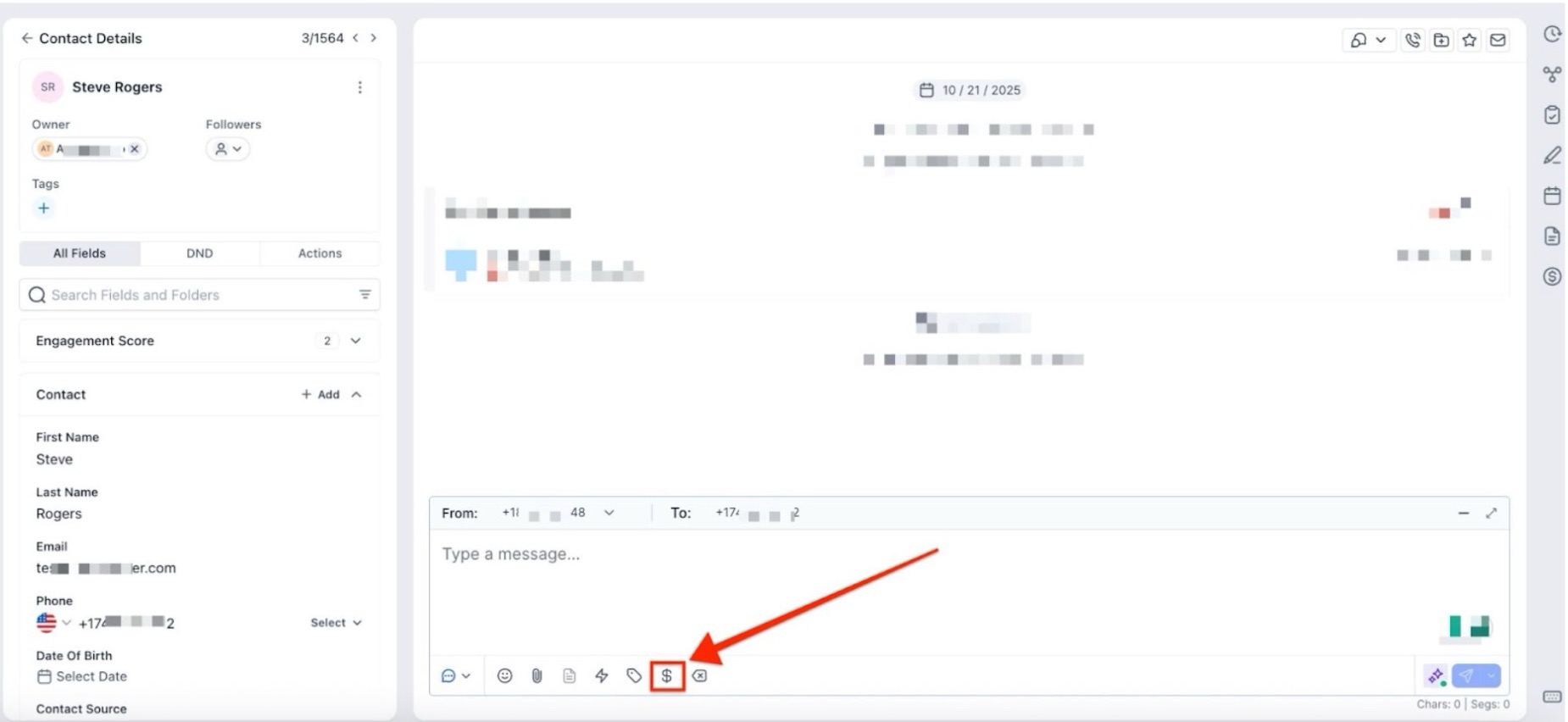 - Navigate to Conversations, choose a contact, click on the Request Payment icon (a circle with a dollar sign), then add a product, taxes, and discounts, and review the total before sending the SMS.