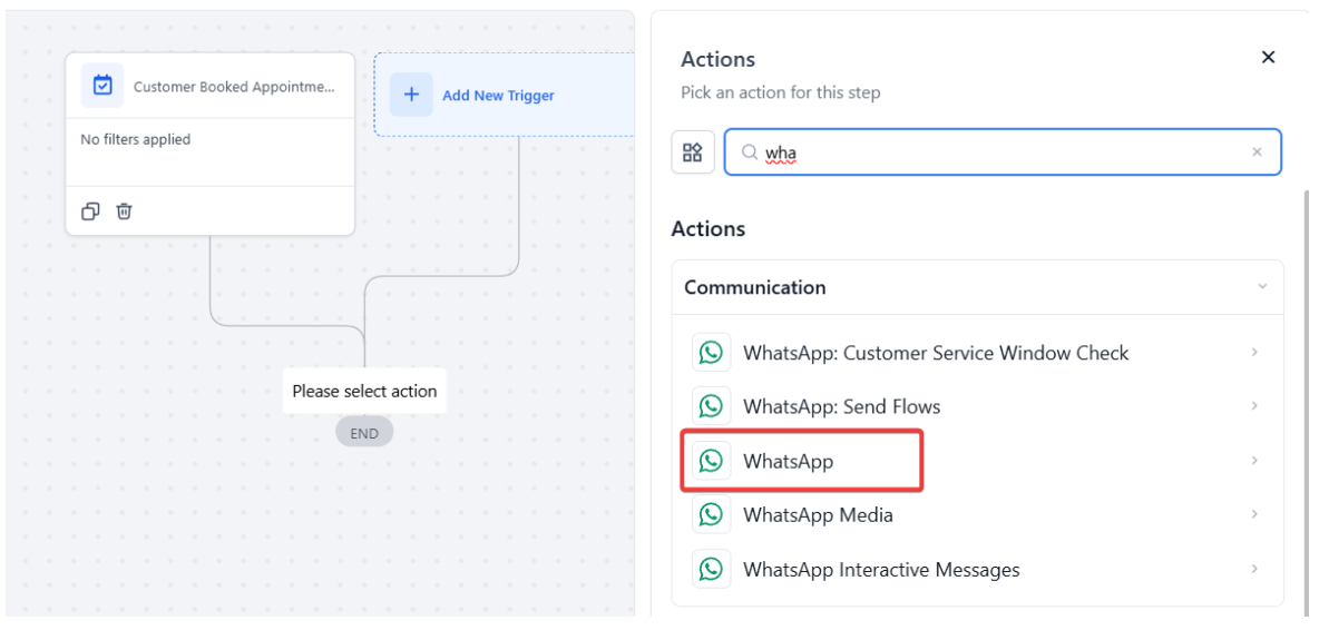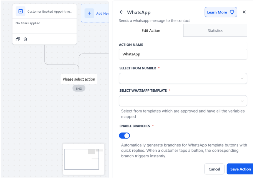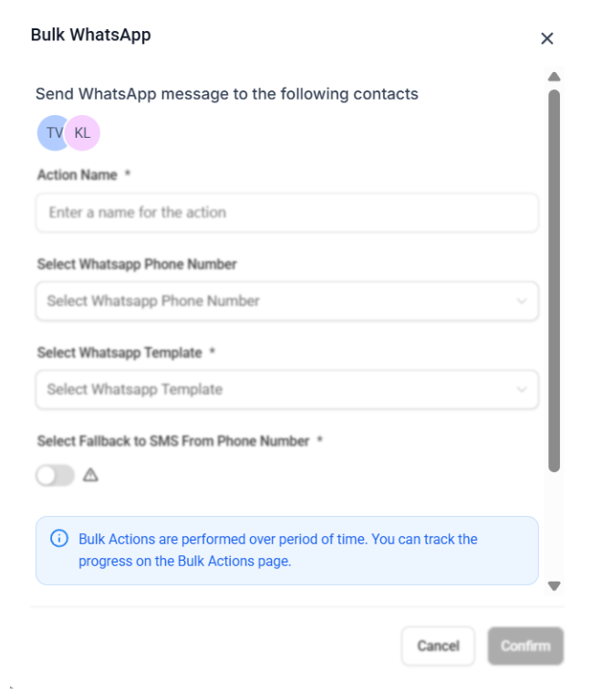 - Select all contacts, click on the WhatsApp icon, choose the template, and add an action name.