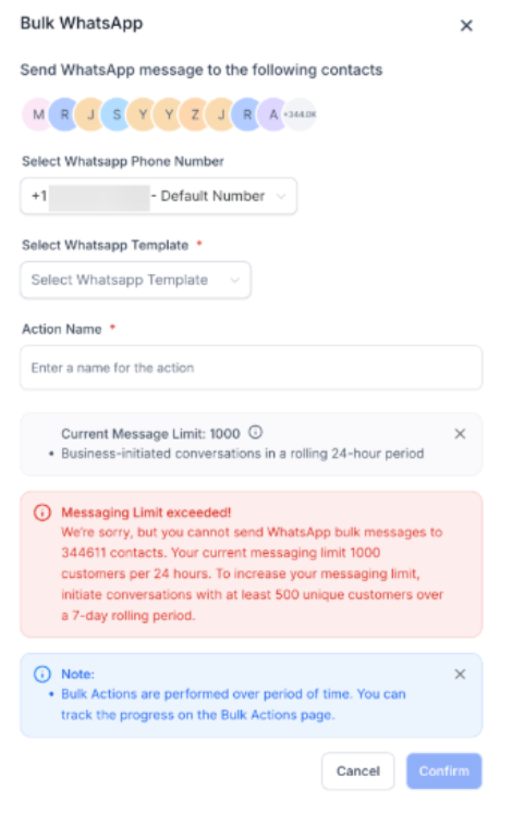 Note: A validation prompt automatically checks your messaging activity to prevent exceeding the set 24-hour limits for bulk messaging. This prompt helps maintain the health of your phone number by ensuring it stays within the allowed thresholds, minimizing the risk of account flags or bans.