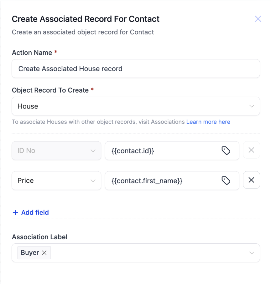 - Create an Associated Record – Generates a new custom object record. Associate the newly created record with a contact using a predefined association label.