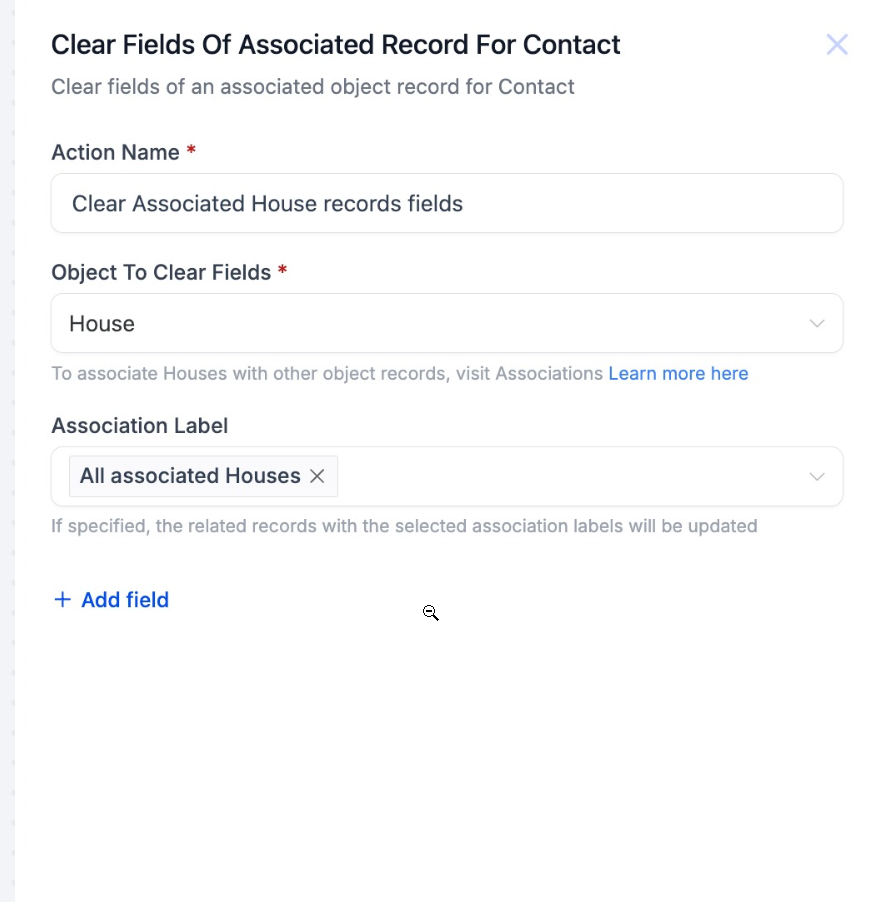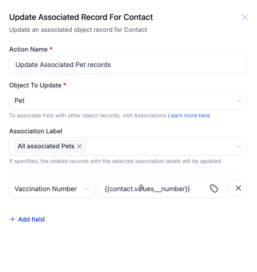 - Update an Associated Record – Modifies fields within an existing associated record. Update specific fields within the associated record when certain conditions are met.