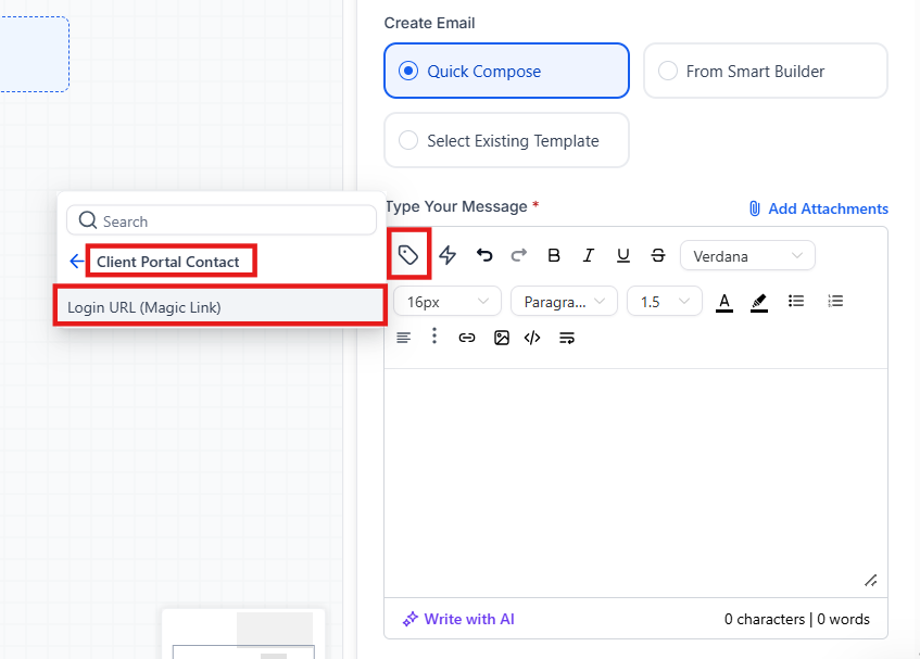 When sending an SMS in a blank workflow, the login URL for a magic link may not appear by default. This occurs because the system requires confirmation that the user is associated with the client portal. To ensure the login URL field is available, use a trigger related to the client portal, such as 'Offer Access Granted.' This action informs the system of the user’s involvement with the portal, enabling the proper generation of the magic link.