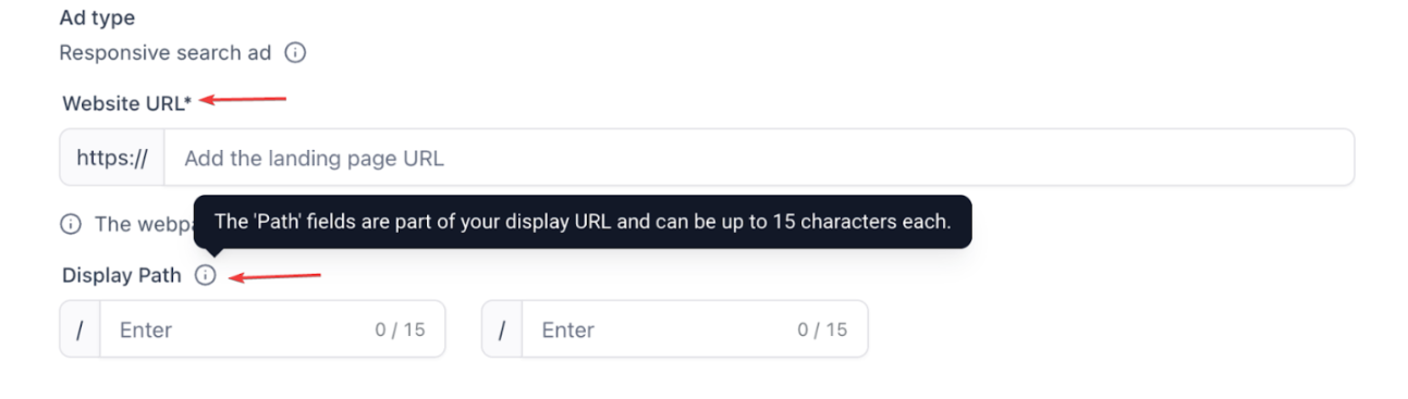 1. Add the Website URL and Display Path. The Display Path is optional and allows you to create a clean, user-friendly URL path on the ad, supporting two segments of up to 15 characters each.