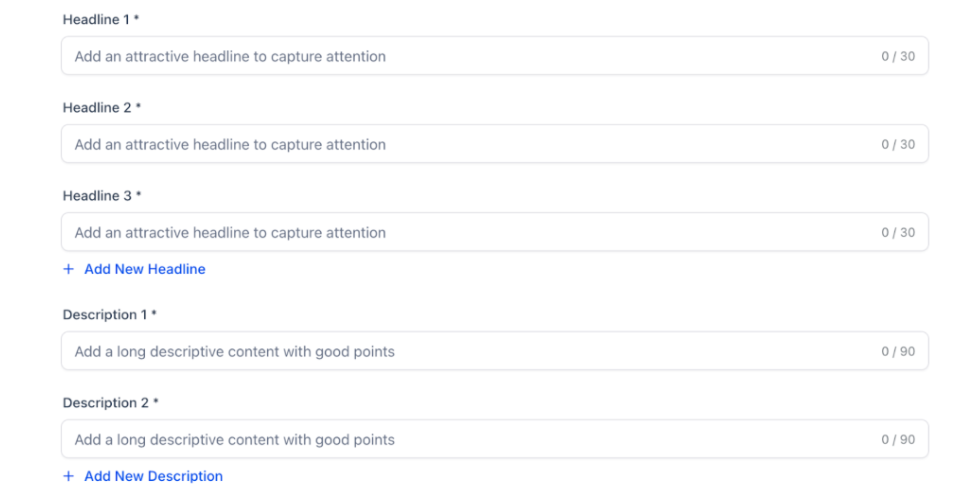 - A minimum of 3 headlines and 2 descriptions are mandatory.