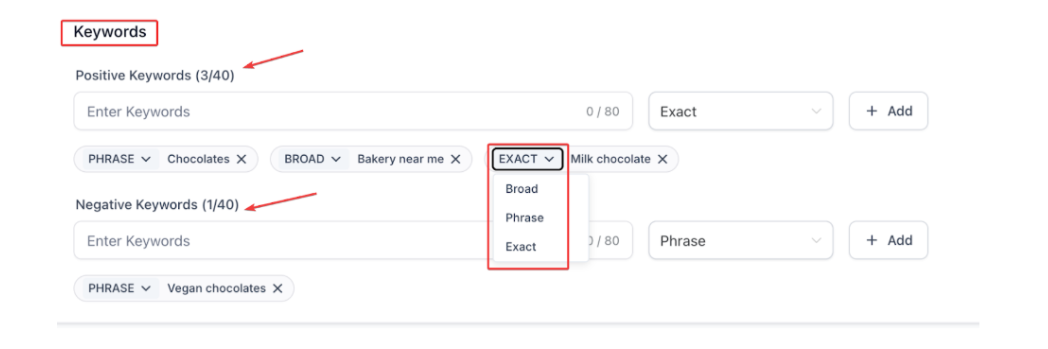 4. Add positive and negative keywords to refine ad targeting. Each Keyword has a match type dropdown: