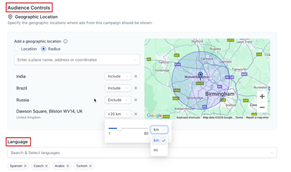 - Complete Control: Design ad content, set daily budgets, and define target audiences by geography and language.