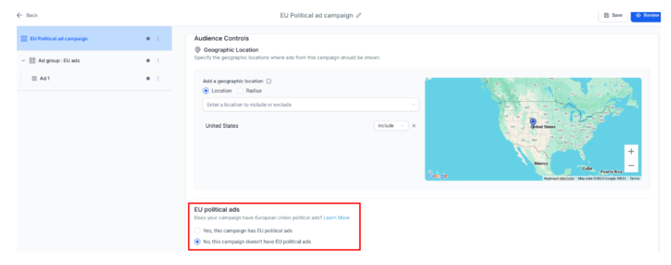 Note: A EU Political Ads field has been added under Geographic Location in the Google Ads campaign setup. Advertisers must select Yes or No to declare if their campaign includes EU political content.