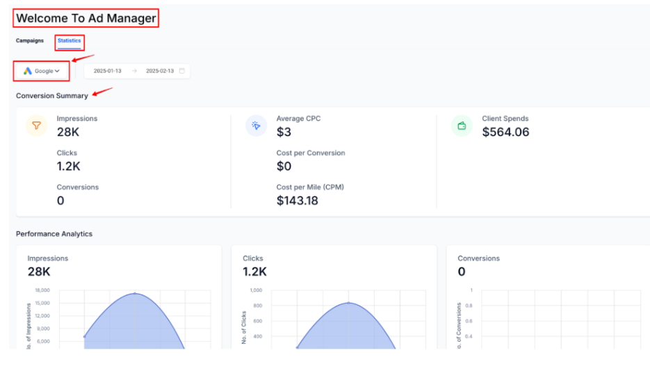 - View performance analytics, including clicks, ROI, CPC, and CTR.