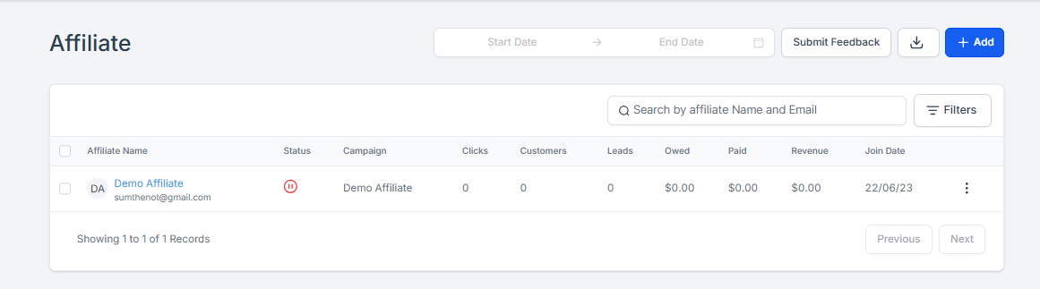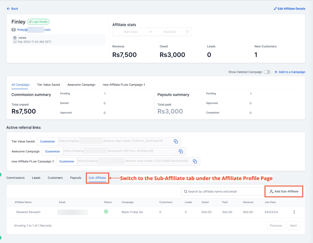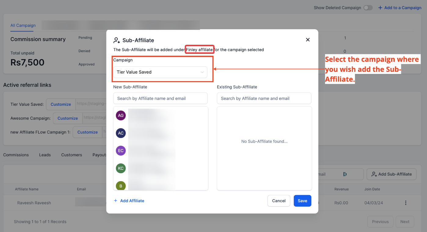 - Choose the affiliate for whom you want to add a sub-affiliate.