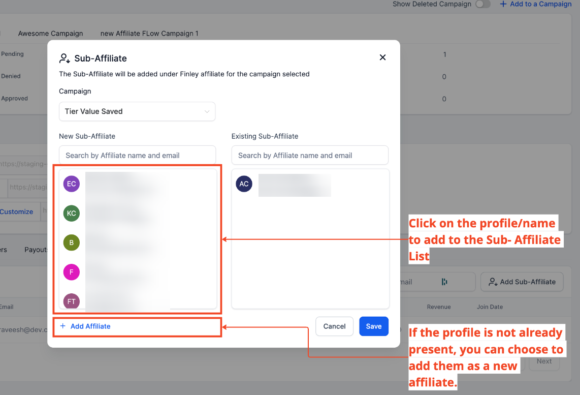 - Click "Save" to add the sub-affiliate to the selected campaign.