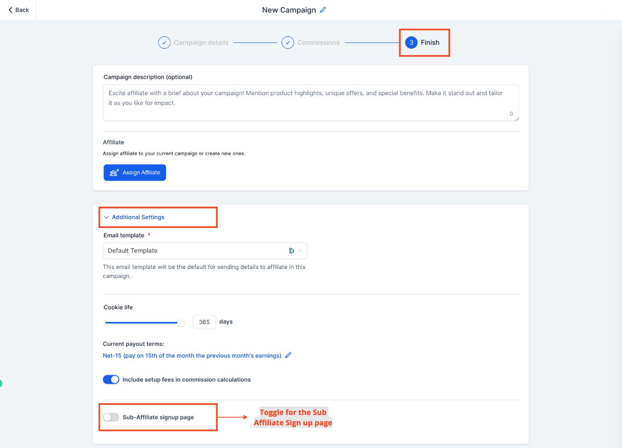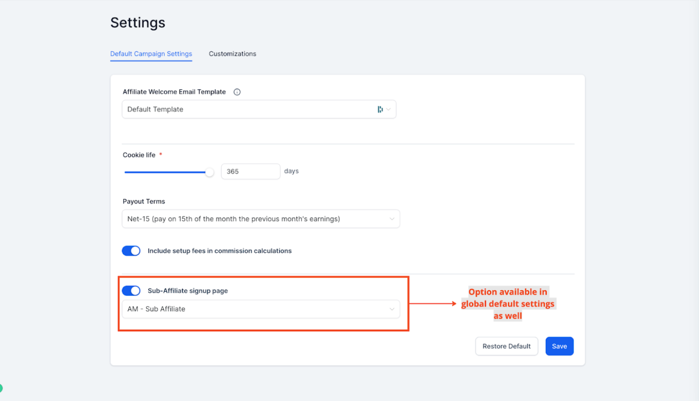 2. Under Default Campaign Settings, enable the Sub-Affiliate Sign-Up Page toggle.