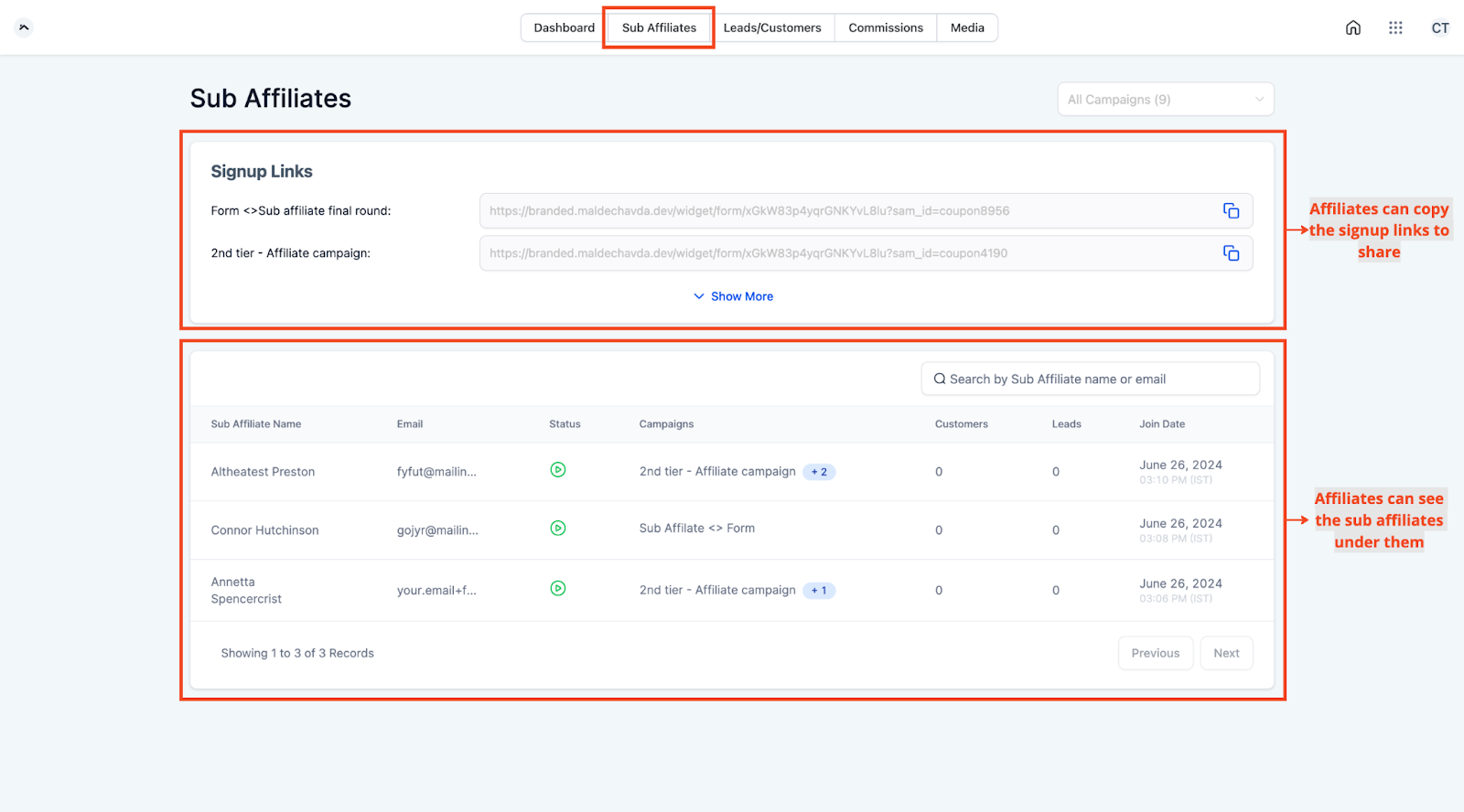 Once the settings are configured, affiliates will have access to a sign-up link in their portal. They can share this link to bring in potential sub-affiliates. The portal will also display all active sign-up form links and provide a list of sub-affiliates associated with each affiliate.