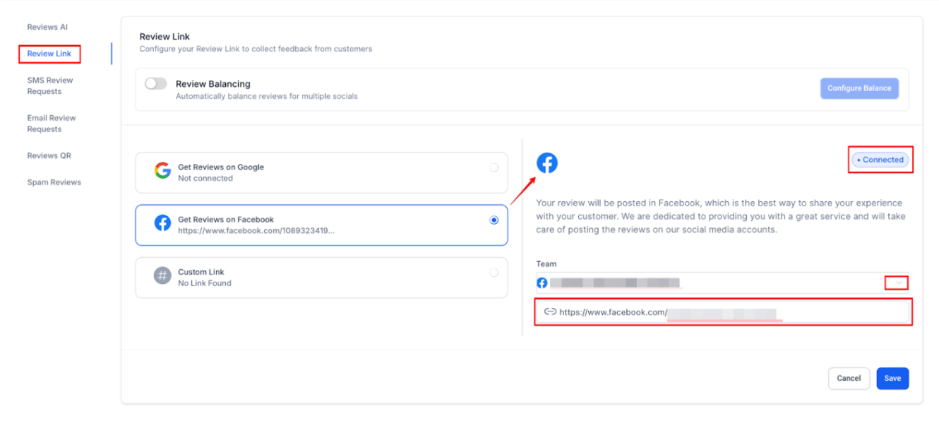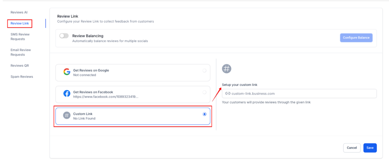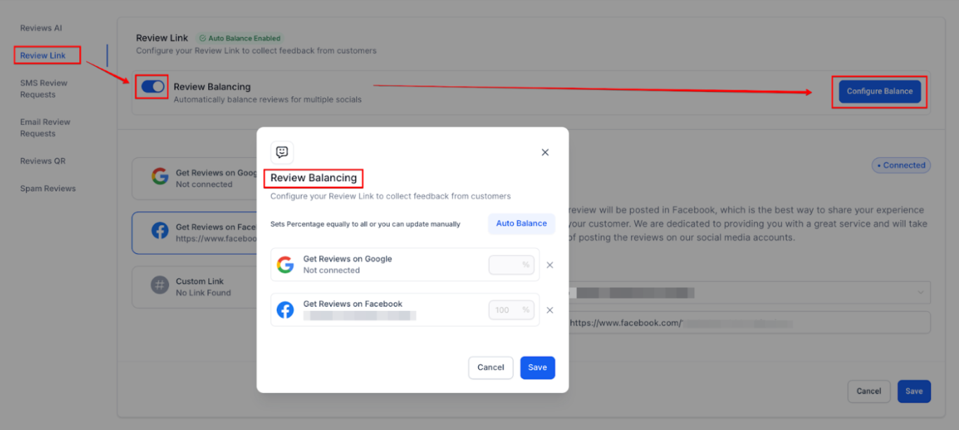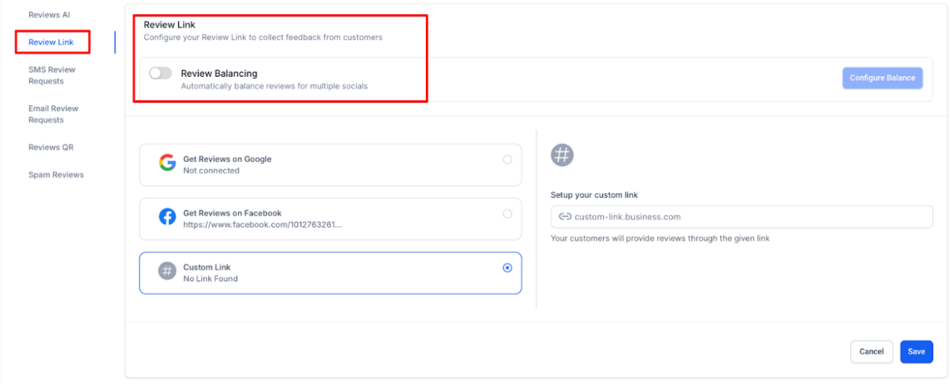 Answer: Review balancing distributes your review requests across multiple platforms to build a well-rounded online reputation. Enable this feature in the Review Link section.
