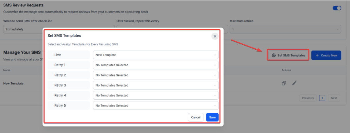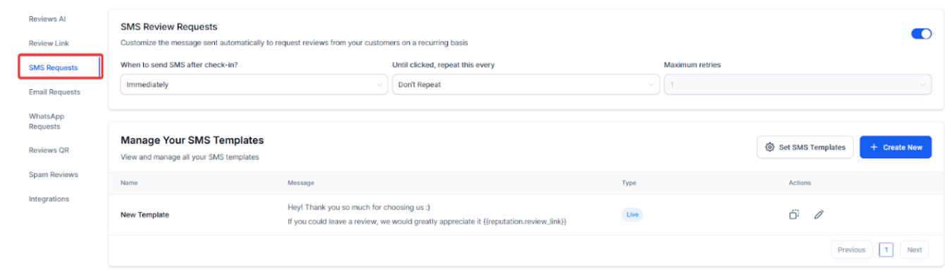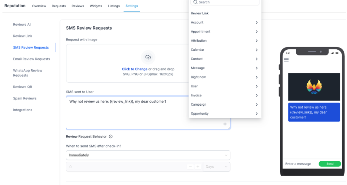 - You can create and personalize SMS templates for recurring review requests. You can use custom templates or pre-built options, and incorporate smart fields like {{contact.first_name}} to personalize your messages.