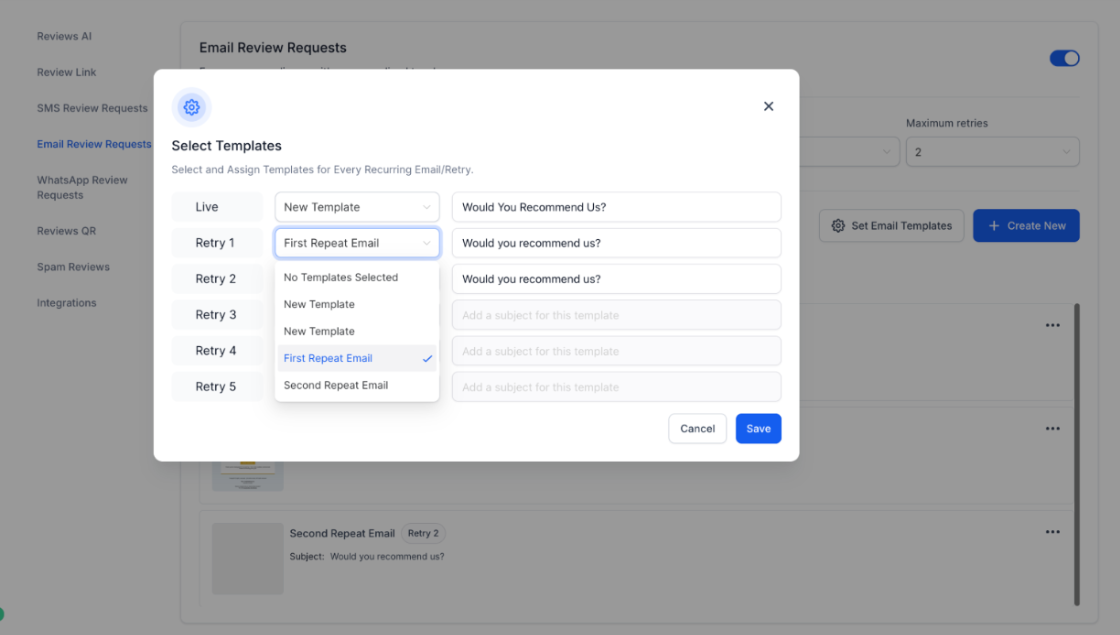 The Email and SMS review requests tab allows you to preview and edit email/sms templates directly within the review request section, streamlining the process and saving you time.