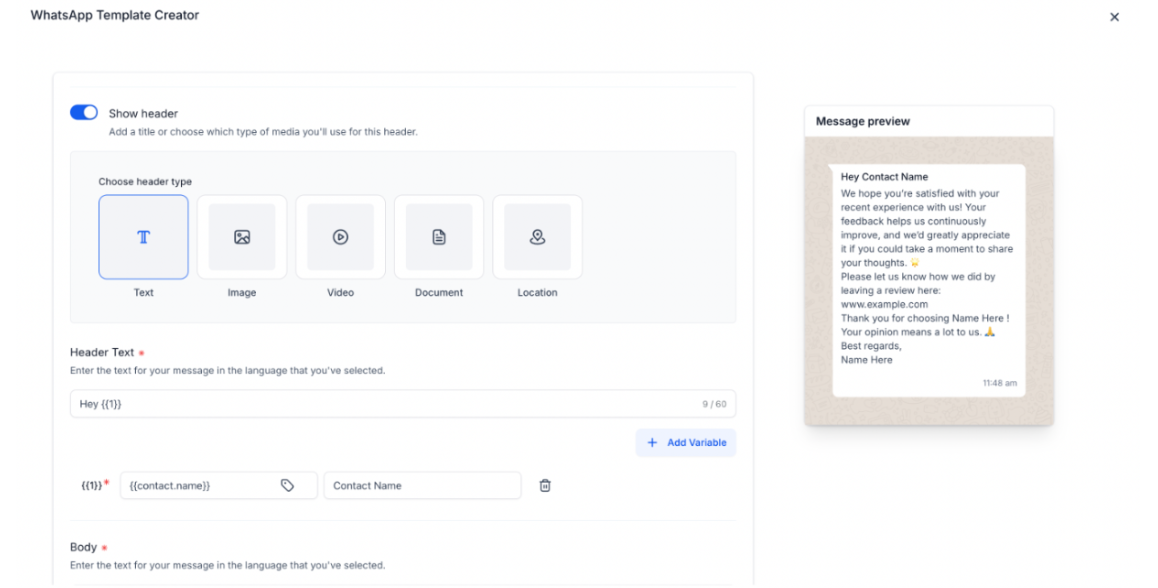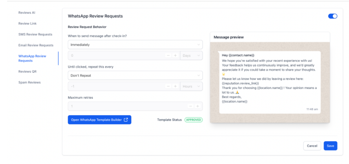 - Go to Reputation → Settings → Review Request WhatsApp, customize your message template, and submit it to Meta for approval (Takes 1-2 minutes).