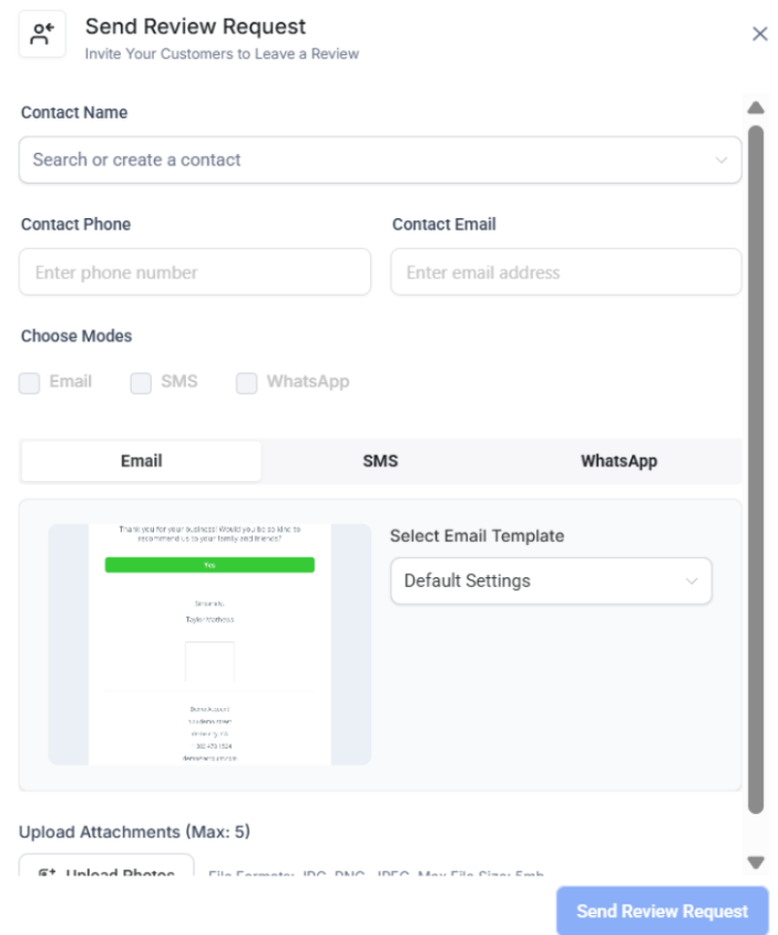 - Contact Search for Review Requests: Search for contacts by email or phone number when sending review requests, making the process faster and more accurate
