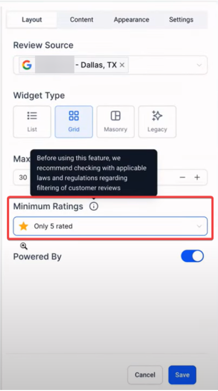 - You can select the option to set a minimum rating for reviews that appear in the review widget.