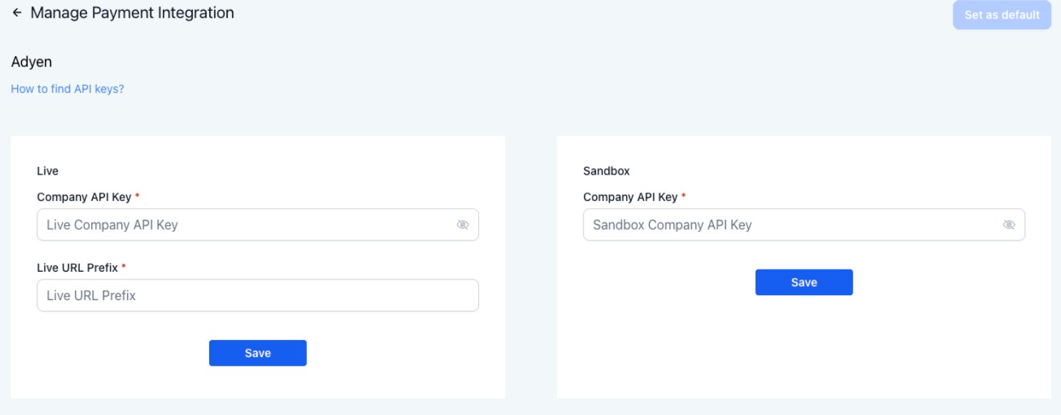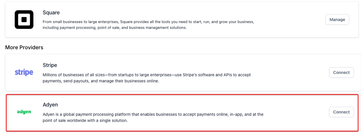 Answer: Go to Dashboard → Payments → Connect Adyen and enter your live or test credentials.