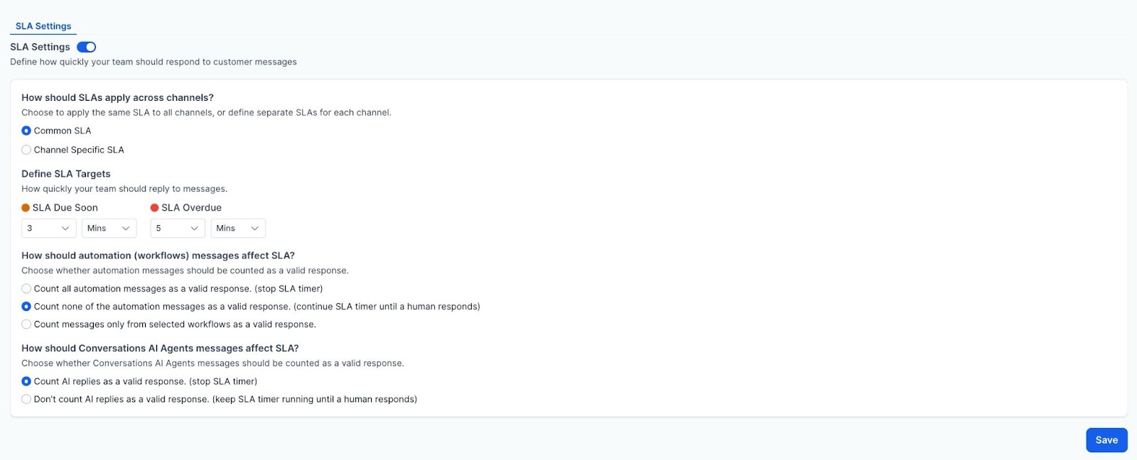 Answer: You can choose whether automated workflow messages or replies from AI agents count towards your SLA timer. This option ensures that your SLA compliance is not affected by automated processes.