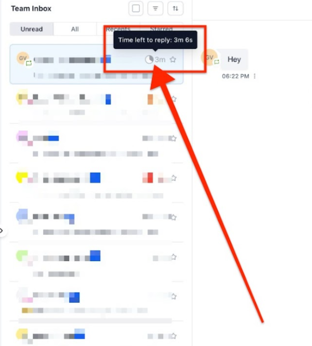 A timer appears next to each conversation in the inbox, indicating whether the conversation is on track, nearing its deadline, or overdue. The color-coded system—grey for active, orange for due soon, and red for overdue—provides immediate visual cues, helping agents prioritize their responses accordingly.
