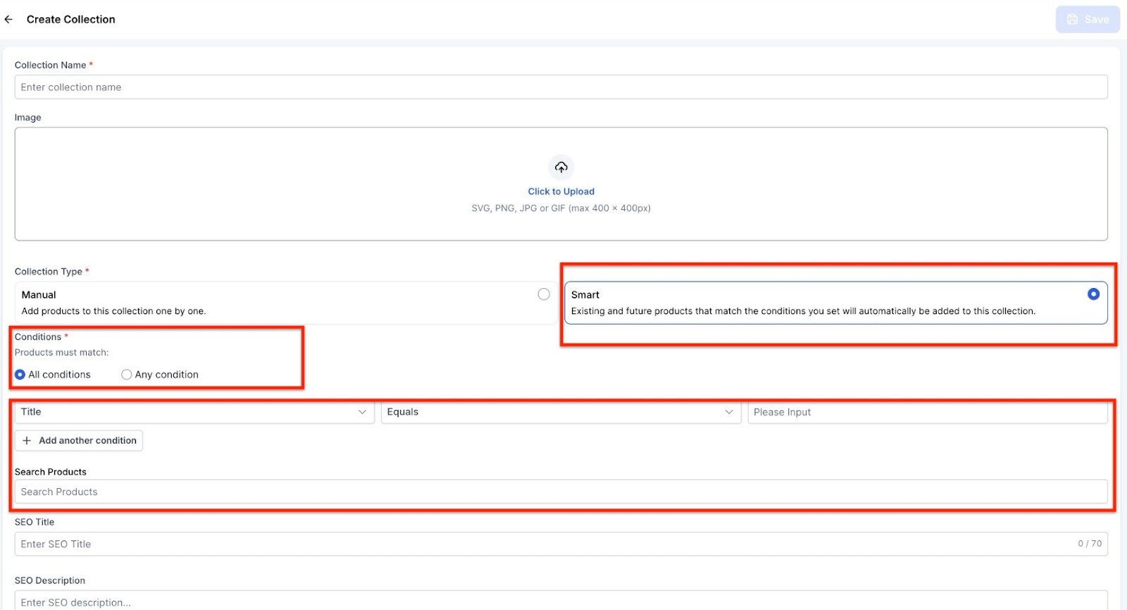 - Smart Collection: Define rules based on fields such as Title, Variant Title, Price, or Inventory. These conditions will determine which products are automatically included.