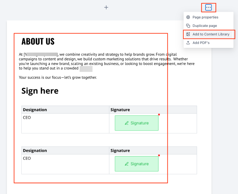 - You can save a single block (e.g., a pricing section, signature table) or all elements on a page.