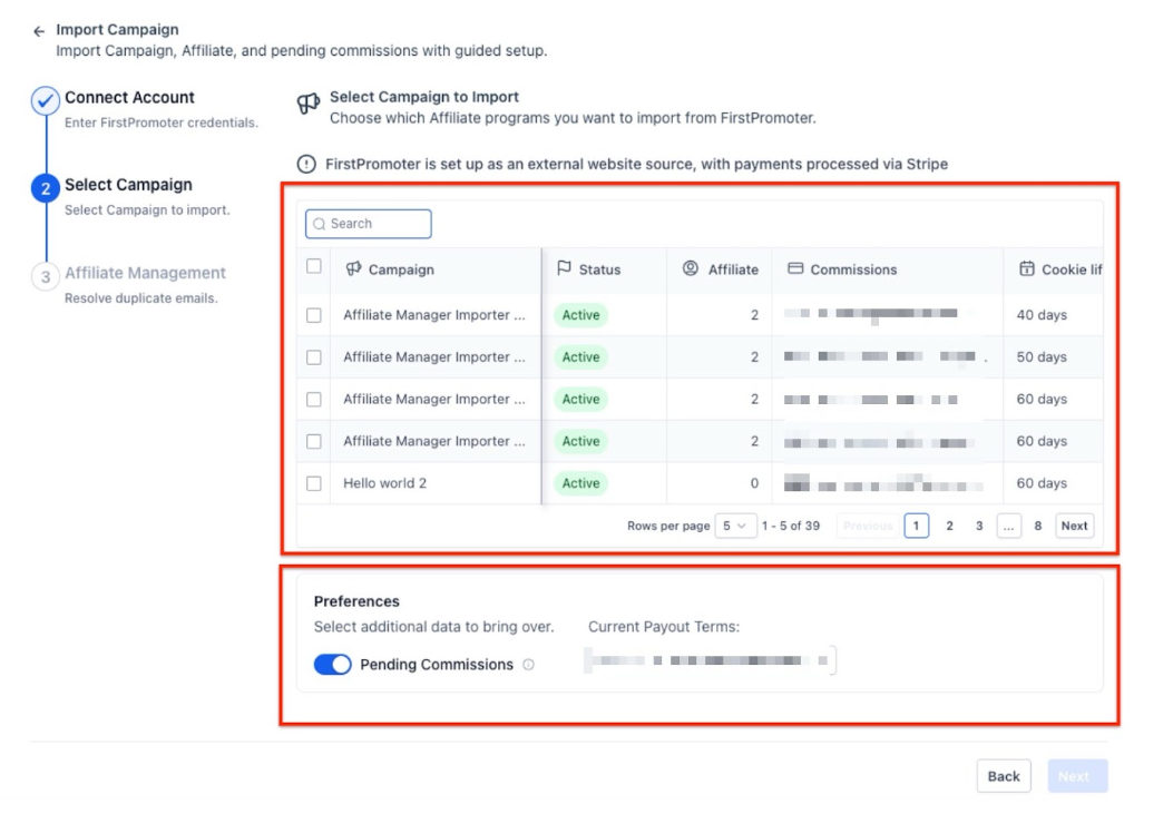 After connecting your account, you’ll be given the option to select the campaigns you want to import. Here, you can view the details of each campaign, such as the commission structure, number of affiliates, and cookie life. You’ll also have the option to include any pending commissions during the import process.