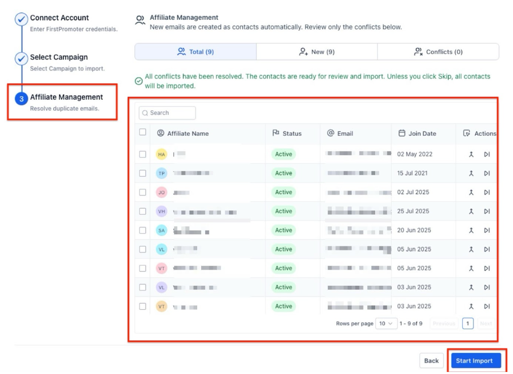 Once campaigns are selected, the next step focuses on affiliate management. Affiliates will be automatically created as contacts in your system. If there are any duplicates (i.e., an affiliate has already been added), the system will highlight these and give you the option to merge, skip, or resolve the conflicts. This ensures that your records stay accurate and clean.