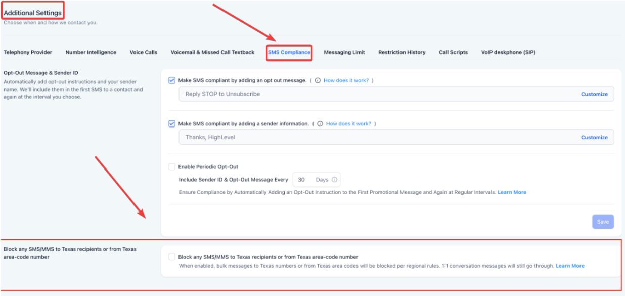 How to enable: Settings → Phone Numbers → Additional Settings → SMS Compliance → Texas SMS Safeguard