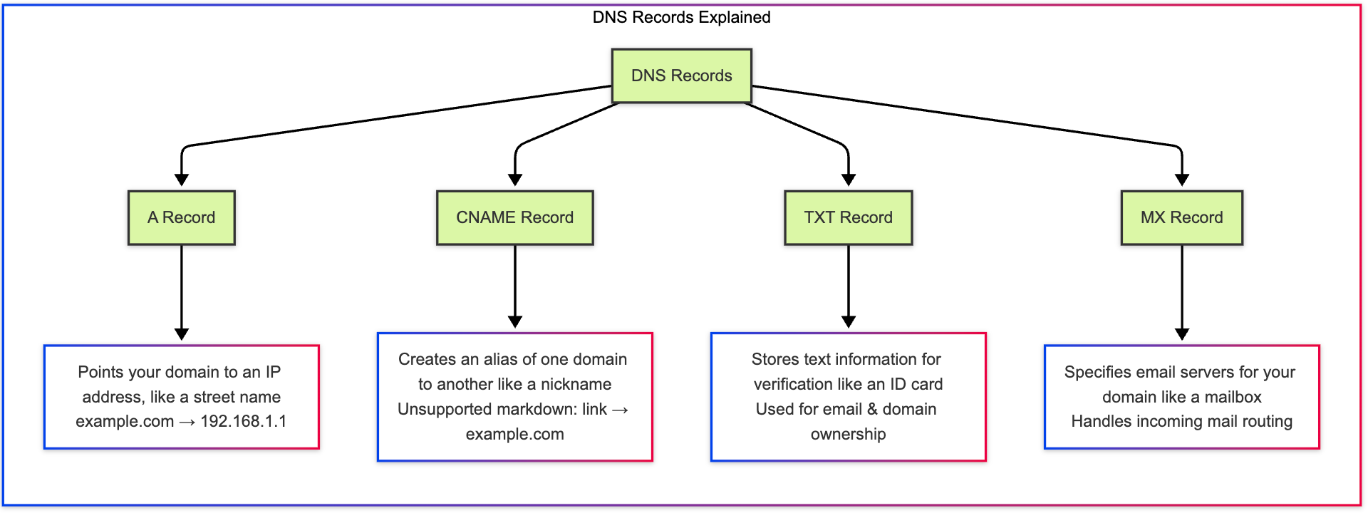 DNS (Domain Name System) records are the "phone book" of the internet. They translate your easy-to-read domain name into machine-readable numbers (IP addresses). To connect your domain to our services, you will need to update these records so the internet knows where to send your visitors.