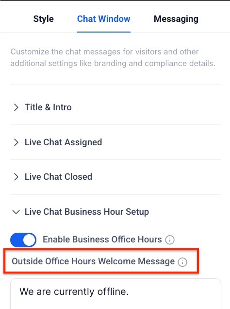 - Set a Welcome Message for outside business hours, such as “We are currently offline.”